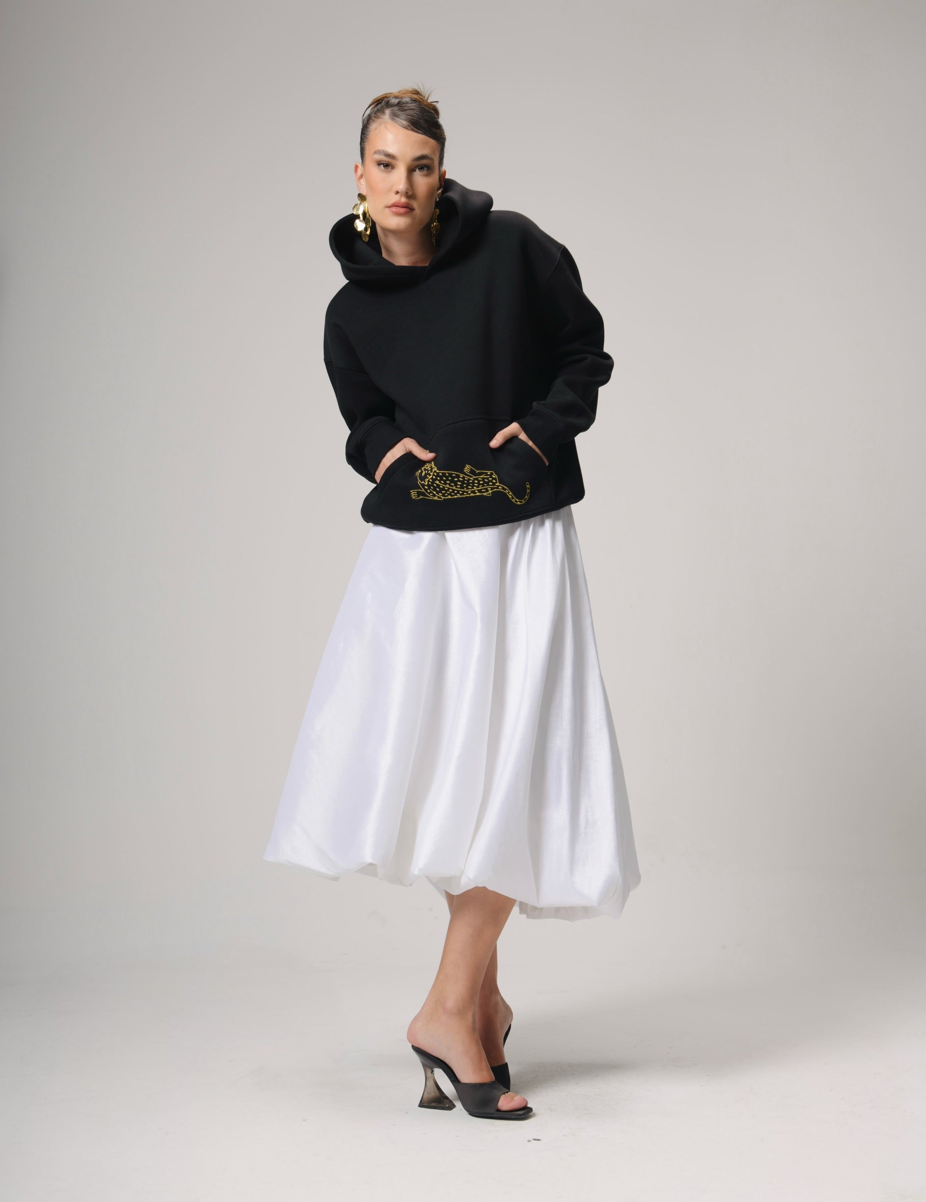 Black hoodie with gold embroidered pockets featuring a tiger design